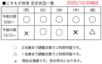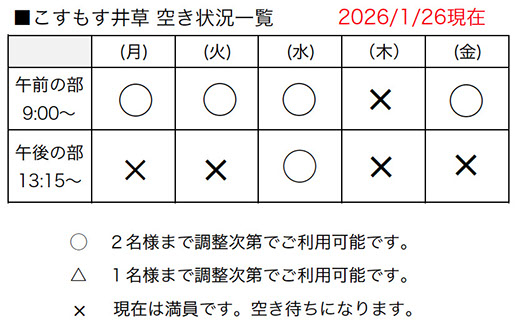 現時点で新規ご利用が可能な曜日・時間帯ごとの状況です。